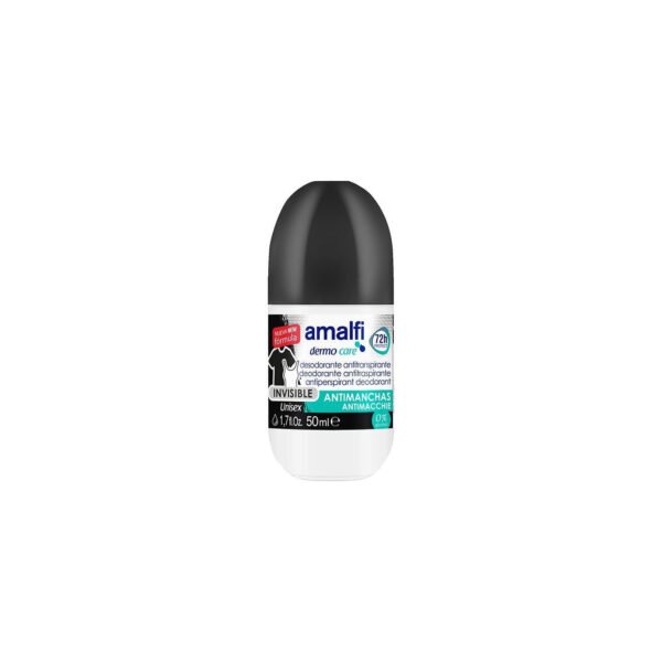 Amalfi Anti-Stain roll-on deodorant with an alcohol-free formula controls perspiration and odor while preventing stains on clothing. It offers long-lasting protection, a pleasant fragrance, and is suitable for sensitive skin.